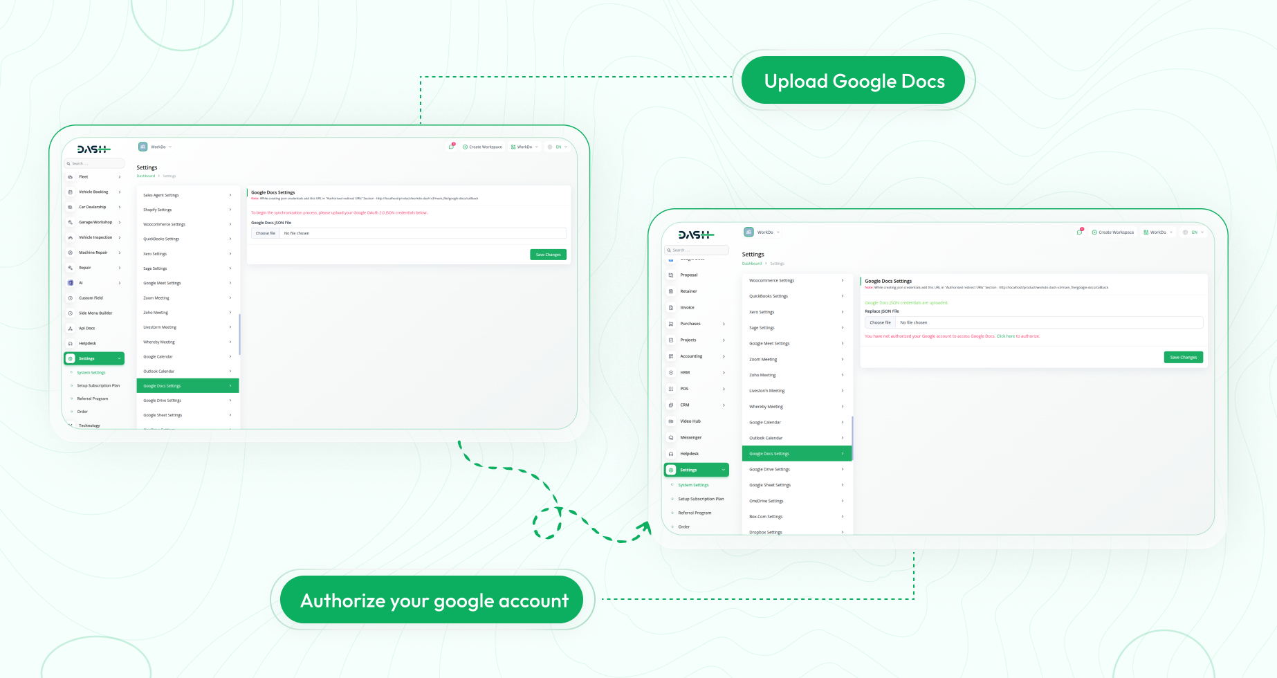 To begin, you’ll need to upload your Google Docs JSON file under the system settings. This allows your platform to securely connect to your Google account. Once the JSON file is added and saved, you must authorize your Google account to grant access. This ensures that the integration is both secure and personalized to your Google workspace.