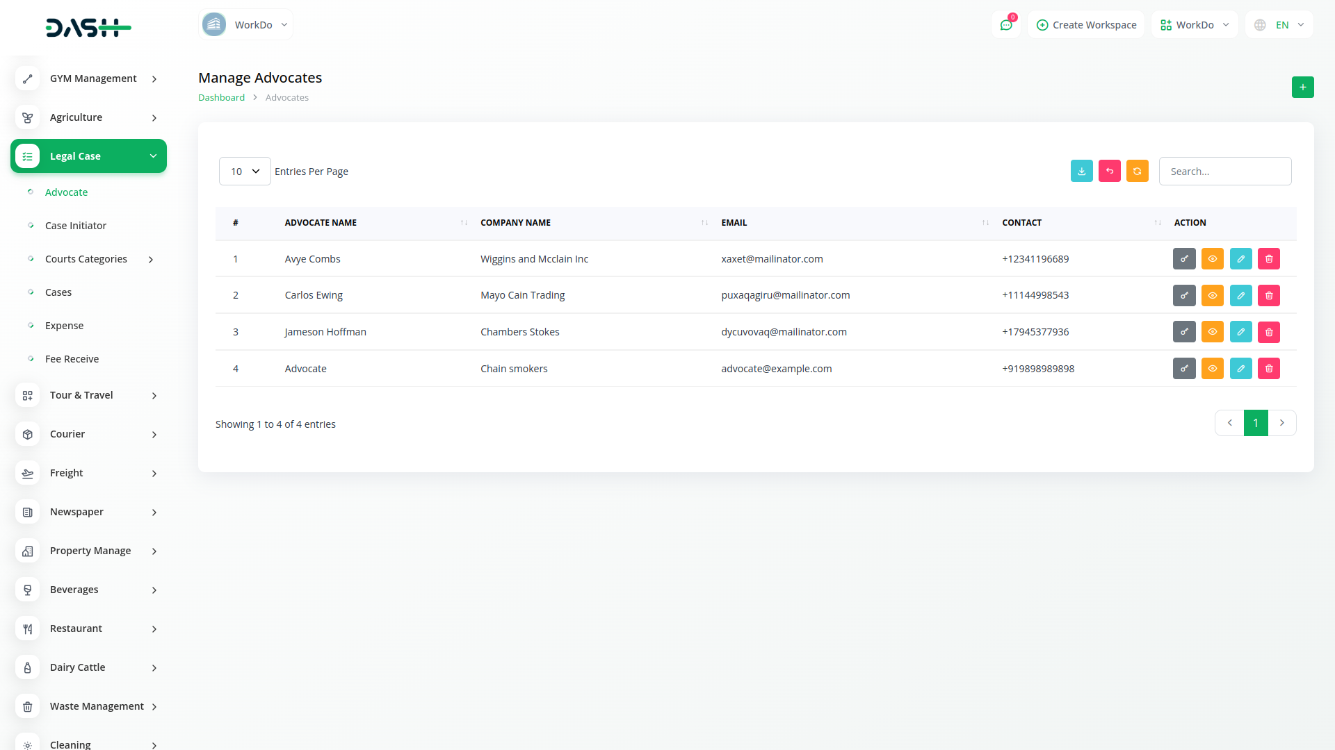 Explore the efficiency of the Numerish Legal Case Management Hub, a dedicated tool designed for streamlined management of advocates, case initiators, and legal proceedings.With a user-friendly interface, this module simplifies advocate details, offering actions like editing information, resetting passwords, and deleting records. Gain insights into case details, client hearings, bills, and fees for efficient case initiator management.