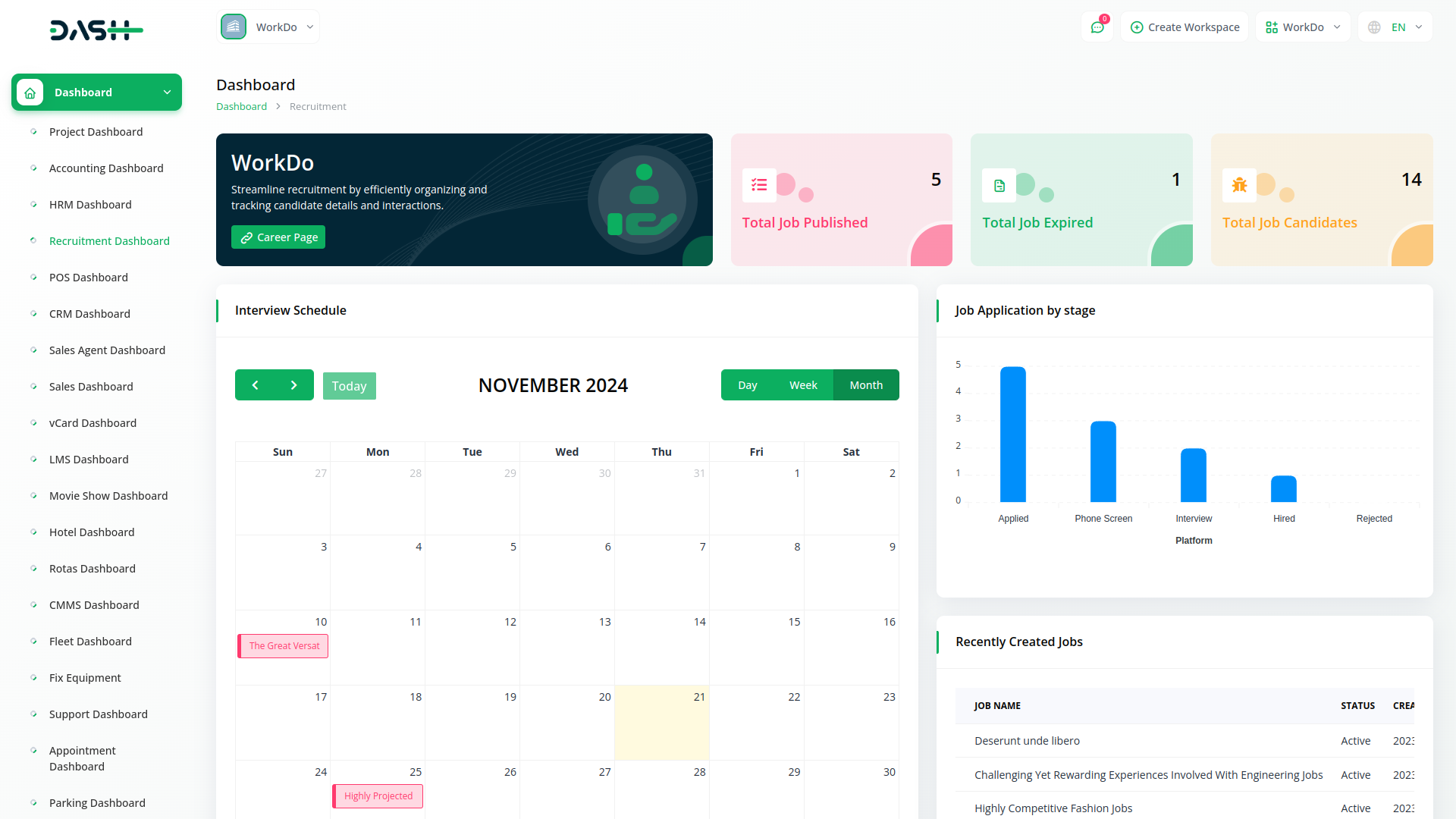 The Dashboard of Recruitment module provides users with an immediate overview of their recruitment activities. It presents key metrics such as the total number of jobs published, expired listings, and the current count of job candidates.